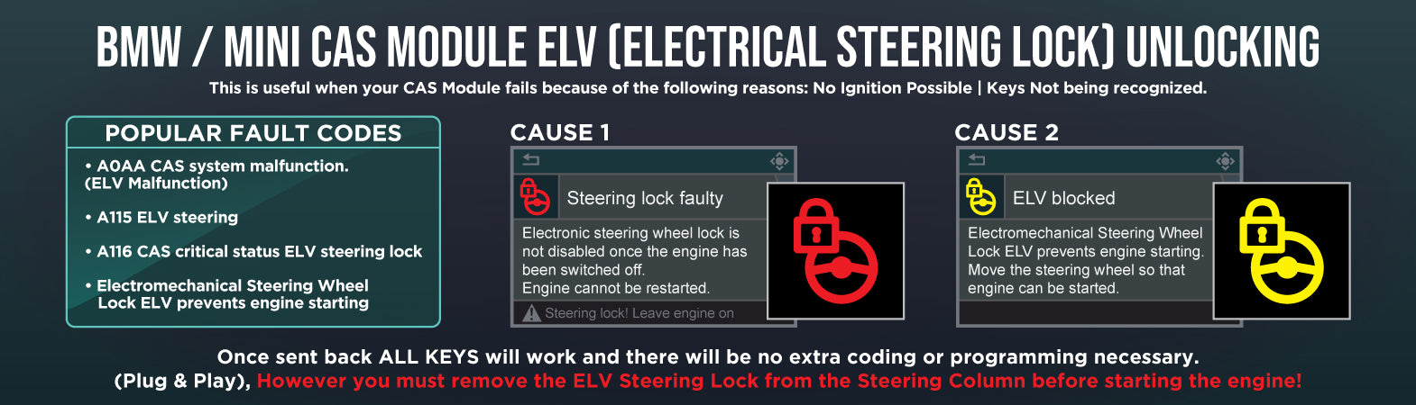 This is a ELV (Electrical Steering Lock) Removal Service for All BMW / MINI Models equipped with CAS 2 and CAS 3 and Modules (Car Access System).