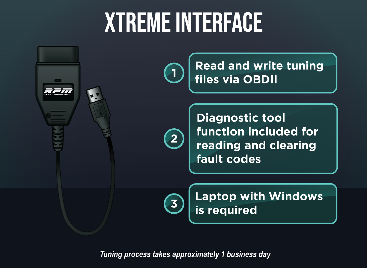 - A Laptop PC with Windows and internet connection are required when writing the tuning files. The Xtreme Interface connects from the USB port in your laptop to the OBDII port of the vehicle when reading or writing.