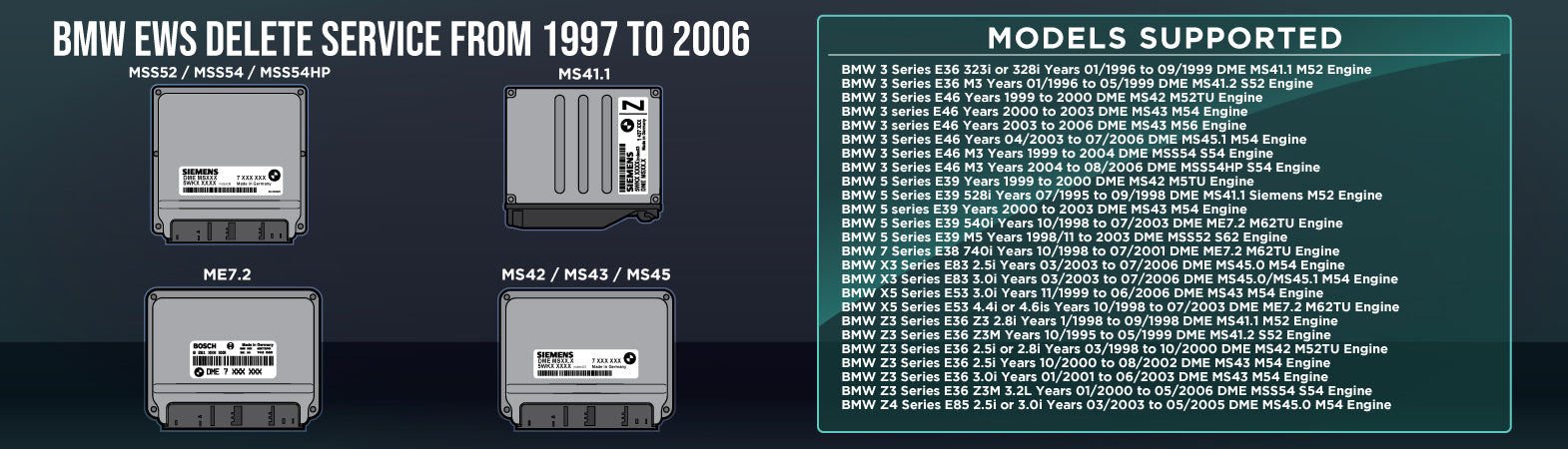 This is a DME Unlocking Service (EWS Delete) for all BMW OLD E-Series with EWS3 / EWS 4.3 models Years 1996 to 2006 that are listed in the models supported.