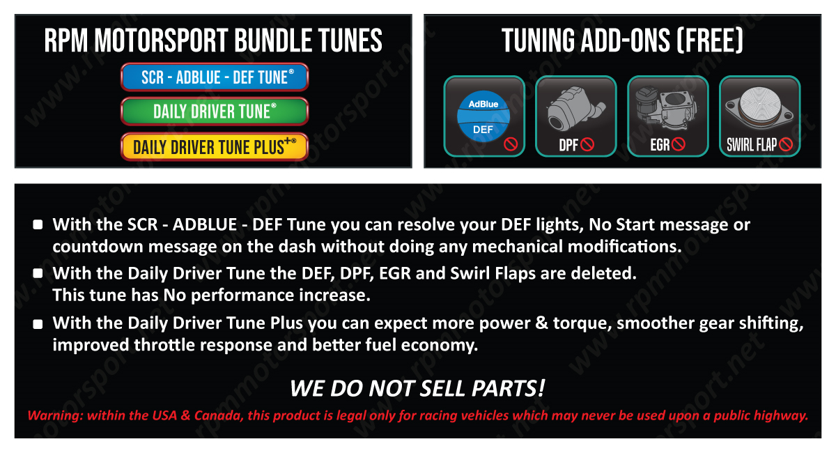 The SCR-ADBLUE-DEF Tune removes all functions of the SCR / DEF system and resolves any DEF light, No Start message, or countdown message on the dash without requiring any mechanical modifications to the vehicle.